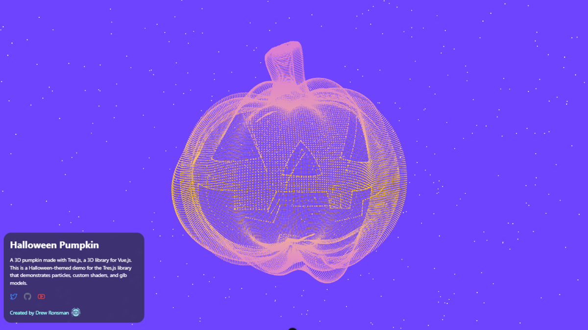 A animated 3d pumpkin that uses shaders, particles, and custom gltf model